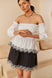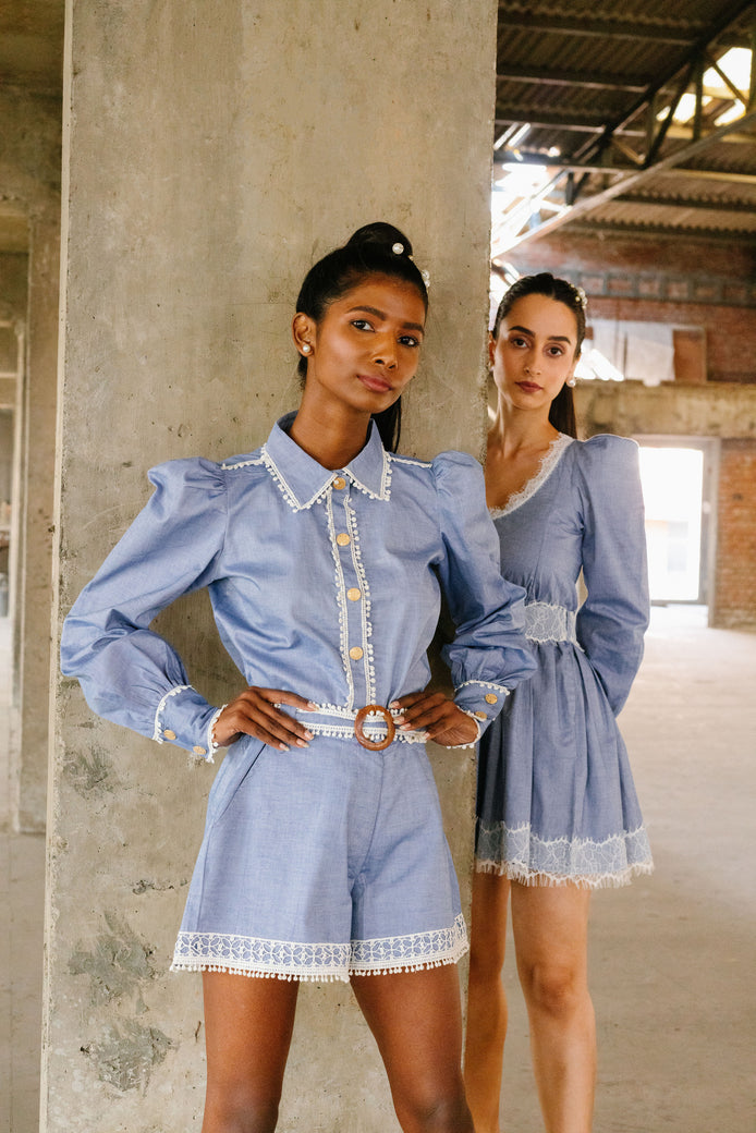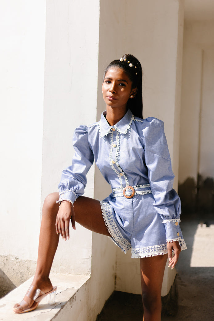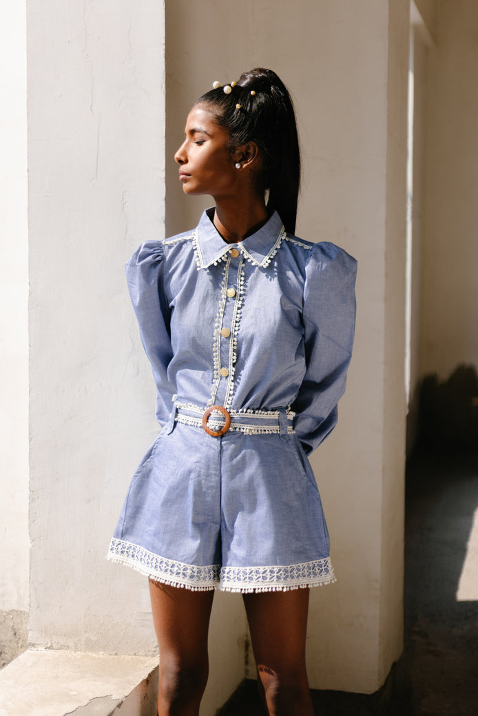 - Design Features: white cotton crochet trim, wooden buckled belt, pockets, elasticated waistband, floral metal buttons
