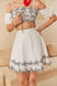 It features a side mother-of-pearl button and concealed zip closure. The skirt is further adorned with white scallop lace inserts in varied designs elevating the garment.