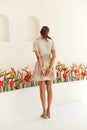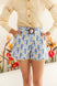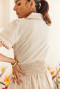 The skirt, hand-crafted in schiffli embroidered linen fabric features a smocked waist and floral lacework at the bottom.