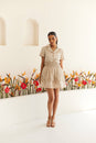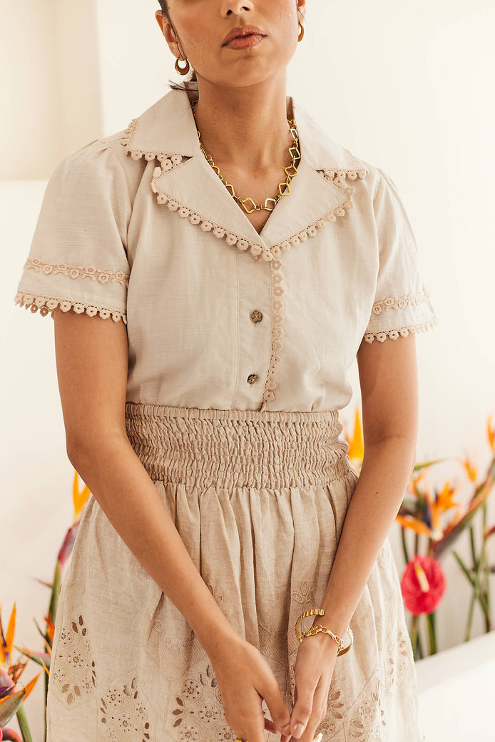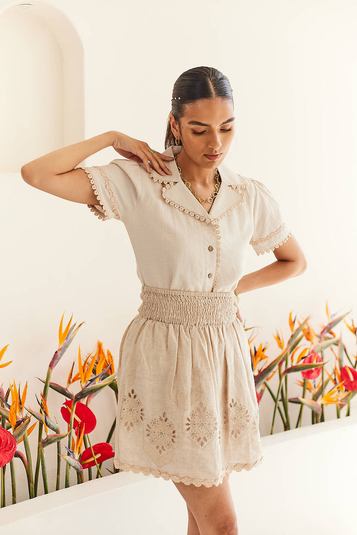 A set of a lapel collared skirt paired with a schiffli embroidered skirt in beige hues.