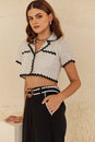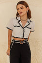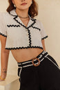 - Black scallop lace detail at collar, sleeve, pocket, placket and bottom