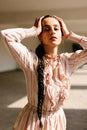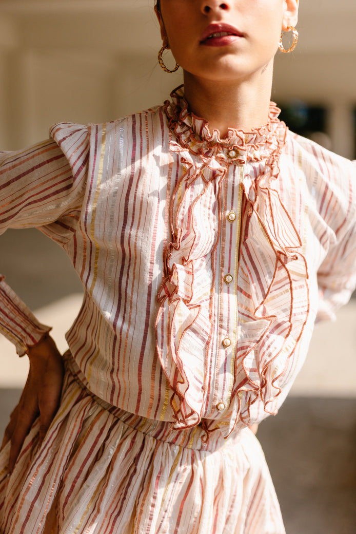 - Design Features: Ruffles, vintage pearl buttons, smocked cuffs, contrast thread detail, elasticated waist, lined skirt