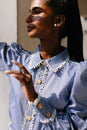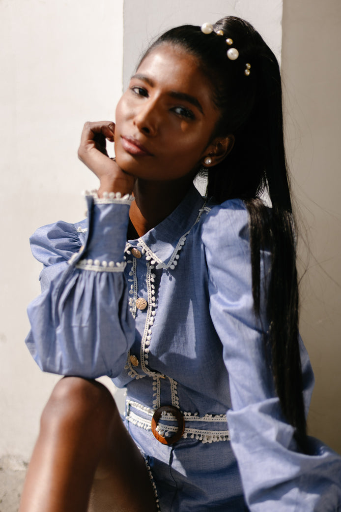 A classic-collared shirt adorned with dainty white cotton crochet trim at the collar, shoulder, cuff and placket. It is further enhanced with rose-gold floral metal buttons at the shirt and cuff opening.