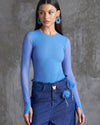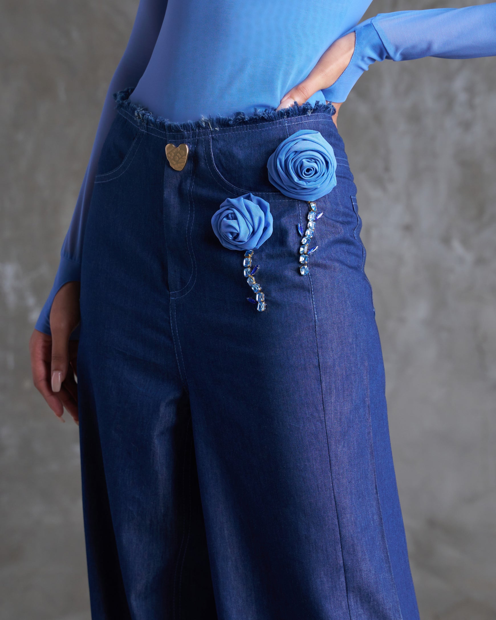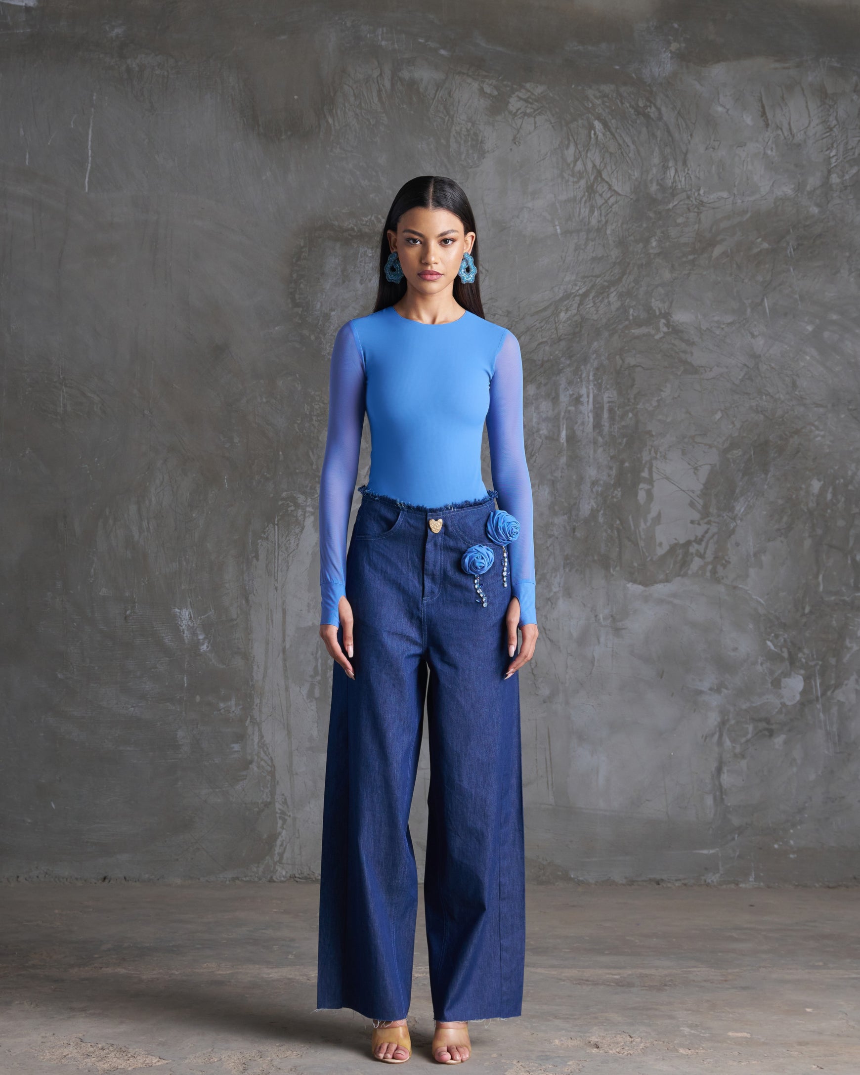 A sleek sky-blue mesh bodysuit with sheer sleeves meets handcrafted denim artistry in this standout set. The smooth, contouring bodysuit balances the mid-waist wide-leg pants, which feature handmade fabric roses, hand-embellished crystal stems, a frayed waistband, and a playful heart-shaped button.